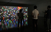 《jewel》が投影される壁の向こう側に、暗闇のなかで光を追えば、《光の曝書》(2014)、《bucket garden》(2012)と続き、さらに奥へ進むと、《Dress》(2015)が現れる。開いた本の頁、バケツに張った水面、天井から吊るされた無数のリボンと、いわゆるスクリーンではないものに映し出される作品との接し方は、子供から大人まで、鑑賞者それぞれの身に委ねられていた。壁に仕切られない開放的な場を与えられた作品は、それらを堪能する鑑賞者を含んだ空間をもって、それぞれの存在感を見せていた。
