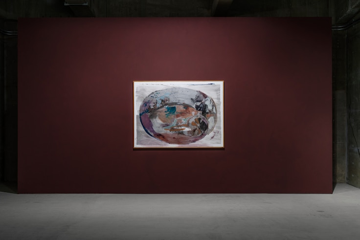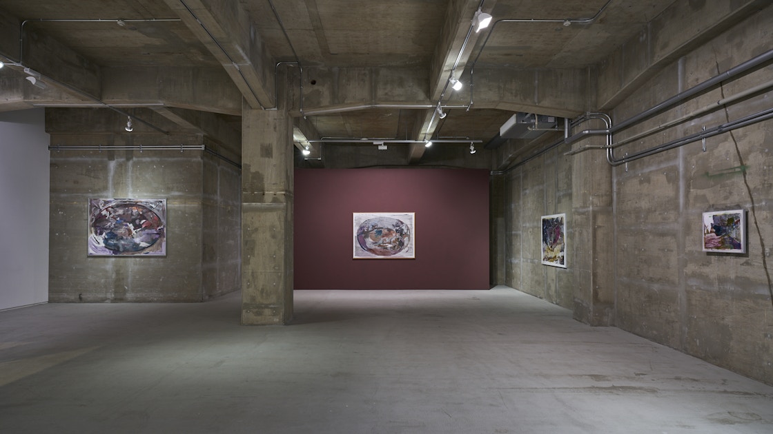 例えば《DSM》(2019)の裏面右下に描かれた、おそらく女性が横たわるように腰掛ける椅子の車輪は、《DSM XII》(2019)ではほぼ同じ位置に拡大されて描かれているし、また両者の構図を反転させたかのような《DSM》(2019)において表面の左側に群がる人像は、《DSM XI》(2019)でもまたほぼ同じ位置に描かれている。6点の小品と絵画群はまったく同一の構図でないにもかかわらず、わずかに観者に感知できる程度にイメージ同士の間で緩やかな対応関係が結ばれているのだ。