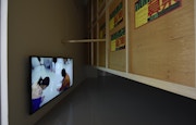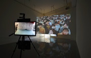 この直感は、《使用済み扉/立て掛け画板》からもたらされる。本作を展示室の正面入り口から眺めると、白く塗られた木製パネルが何枚も立っているように見える。さらに、部屋の中央にはその展示室内を映した動画が入れ子構造的に投影されており、全体的に白の矩形で構成された硬質な空間となっている。