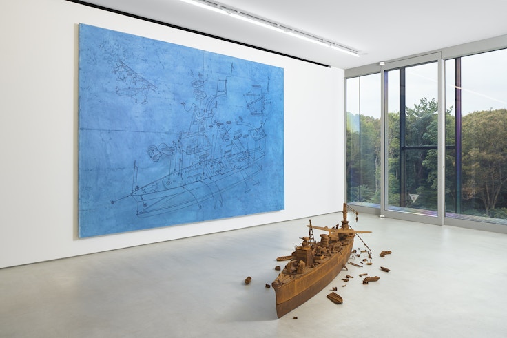 フィリピンはコロン湾の水深33メートル地点で現在も沈黙し続ける旧日本帝国海軍の水上機母艦「秋津洲(あきつしま)」。Blum & Poeでの柳幸典の初個展は、1990年代後半から2000年代初頭にかけてつくられたこの秋津洲をめぐる旧作と新作によって構成された。
