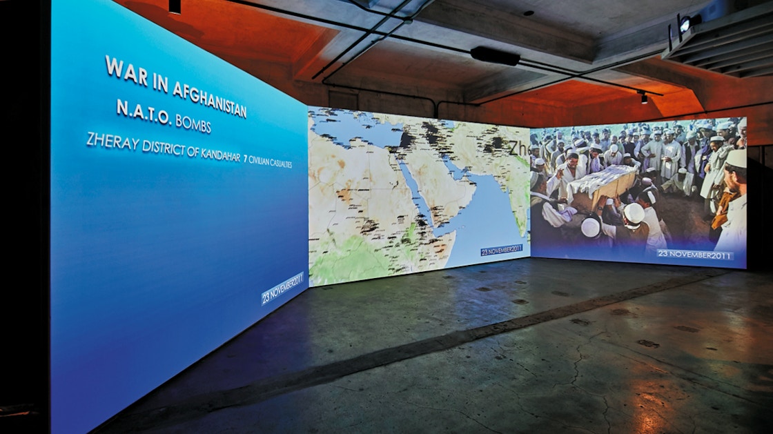 最後に付け加えておかなければならないのは、これらの空爆の歴史を通じ、北米の地図が映し出される場面がほとんどないことだ。これに対し、左面で提供される攻撃の主体は圧倒的にアメリカの作戦によるものが多い。例外は2001年の「9.11=アメリカ同時多発テロ事件」で、その爆撃の規模は空爆の歴史を通じ、決して大きいものとは言えない。しかしその直後からアフガニスタンを皮切りに始まる「対テロ戦争」を口実とする空爆がいかに容赦なく、また長期に及んでいる か。私たちは知識や「正義」ではなく、このような機会を通じて視覚的にも知らなければならない。