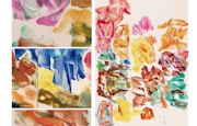 教室では子供たちが賑々しい。なぜだか先生はおらず、本を読んでいる子もいれば隣に話しかけるのもいる。工作をし始めたのがいるかと思えば、窓の外を眺める子もいる。そうこうしているうちに机の列もすっかり乱れて、形や色もバラバラになってきた──はじめのフロアに展示された岡﨑乾二郎の近作絵画を眺めながら浮かんでくるのは、そうした「子供(たち)の情景」だ。絵画全体を覆うほどに大きくはないが、しかし放縦で落ち着きのない存在たちが絵画のなかで騒めいている。タブローは複数に分割されているので、並び替えれば新たな作品へと早変わり。そんな想像は不謹慎だろうか。