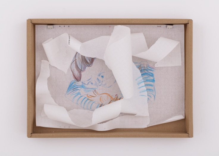 作品の脱着式の可変性は、階層をひとつ上がった次のフロアでも見られる。有機的な形状をした複数の塊が組んず解れつしながらひとつのボリュームをなす彫刻たち。これらの要素もまた、それぞれに閉じられた形を持っており、取り外して組み替えることができそうだ。岡﨑も好んで取り上げる熊谷守一のネコのごとく彫刻はテーブルの上でくたりと休らい、そのなだらかな曲面をそっと撫でたくなる。ネコもまた脱着式──とまでは言えないながら、きわめて可変的な形態を持つことで知られる。さらに階層を上がったフロアでは、ビリビリと紙をやぶって巻き上げながら色鉛筆を走らせた《ポンチ絵》(2014)が現れる。ここでもまた、風景や静物といった絵画の古典的な題材に交じって、子供や動物たちの姿と出会うことができる。