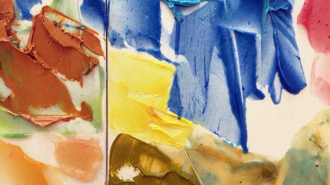 展示の終盤、代表作と言える同一サイズによる二幅対の絵画群が現れる。一見すると画面全体にわたって乱雑に、偶然性をもって散らされているかのようなストローク。しかし2枚をよく比較してみると、即興的に描かれたように見えた筆触は、キャンバスを跨いで色彩や大きさを変化させながら反復されていることがわかる。一方のキャンバスに張り付いている絵具の形が、反転しながら他方のキャンバス地の塗り残しとして現れるさまは、脱着式のパーツを組み合わせるパズルを思わせもする。奔放な身振りをもって描かれているかのような作品は、その実きわめて分析的な操作の徹底によって構造化されていたのである(*1)。