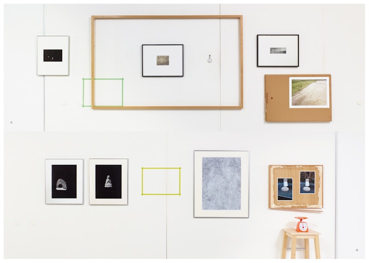 会場に入ると、コレクションから選ばれた作品群(多くは写真)と麥生田自身の写真作品が、キャプションもないまま、ゆるやかに混在している。「水面をとらえた写真」「モノクロの構成美」などグルーピングの関連性が瞬時に把握できる壁面もあれば、近づいてよく見ると、構図や形態の類似性に気がつく壁面もある。だが、本展は、そうした関連性(類似と差異の「発見」)を読み解く楽しみだけにはとどまらない。注視の眼差しは、「作品」の周囲に仕掛けられた不穏なノイズへと横滑りしていくだろう。気温計、気圧計、照度計、時計、文字通りノイズを発するガイガーカウンターやラジオの受信機。壁の日めくりカレンダーは毎日破られて紙片が溜まっていき、観客も入場者カウンターの数値の更新としてカウントされる。場の恒常性は秘かに揺るがされている。また、ひとつの壁面ごとに必ず、「その壁面を撮影した写真」が入れ子状に作品然として「展示」されている。だがその位置は、配布された記録冊子をめくれば、「マスキングテープで場ミリされた空白のフレーム」に置き換えられている。そして、麥生田の写真作品は、梱包材や木箱の上に置かれたり、ラフな仮止め状態にとどめ置かれ、あたかも作業途中であるかのような、流動的な仮設性を加速化させていく。