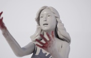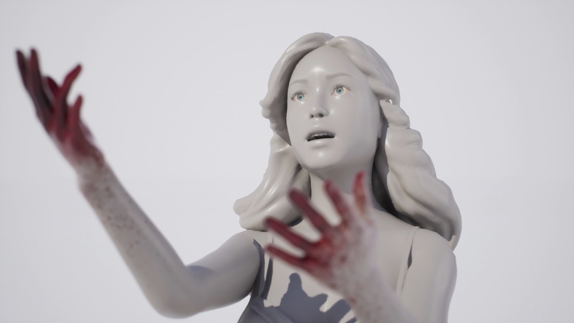 これは本展で発表された二画面の映像作品《Jokanaan》(2019)の中に出てくる少女、サロメのセリフだ。本作は、リヒャルト・シュトラウスのオペラ『サロメ(Salome)』の1シーンを、3DCGの少女と、モーショントラッキングスーツを身につけた男性ダンサーに演じさせたものである。「でもあなたは死んでしまって その首はもう私のもの」と、彼らは歌う。