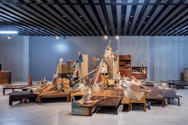 その先には、八木山にかつて存在した越路山神社の鳥居の修復からはじまる《僕の町にあったシンデン─八木山路山神社の復元から2000~2019》(2019)がある。仙台市民から集められた箪笥が連ねられた四角い空間の内外には、青野の幼い頃の様々な記憶と、仙台市を見守るように存在してきた八木山という土地の抱える歴史が文字通り溢れんばかりに詰まっていて、まるで八木山という場所の持つ霊性を、まるごと再生させようとするかのような気迫が空間に満ちている。