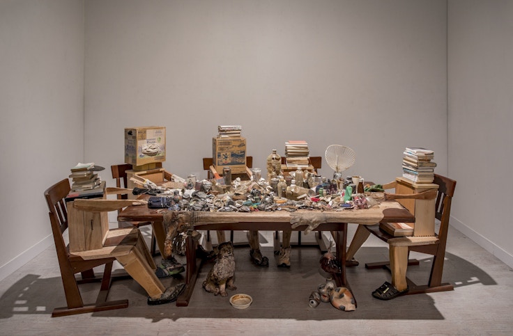 中央には「この土地に眠るすべての者の魂」としての人型があり、それを「おどが森の巨人(ダイダラボッチ)」が見下ろしている。巨人は、仙台市を見下ろす八木山の存在とも重なり合う。展覧会を鑑賞する私たちは、震災の夜の青野の記憶とともに「どこか別の世界」であるシンデン、そして八木山に足を踏み入れ、2011年3月11日を遥かに超えた過去の時空をさかのぼり、最後の作品である《幾万年の食卓─3.11の夜を経て(青野家のテーブルセットより)2019》(2019)にたどり着く。そして展覧会は、3月11日の夜を過ごす青野家の食卓が、その世界のなかで永遠に続いていることを示唆するように終わりを迎え、私たちを元の世界へと戻す。