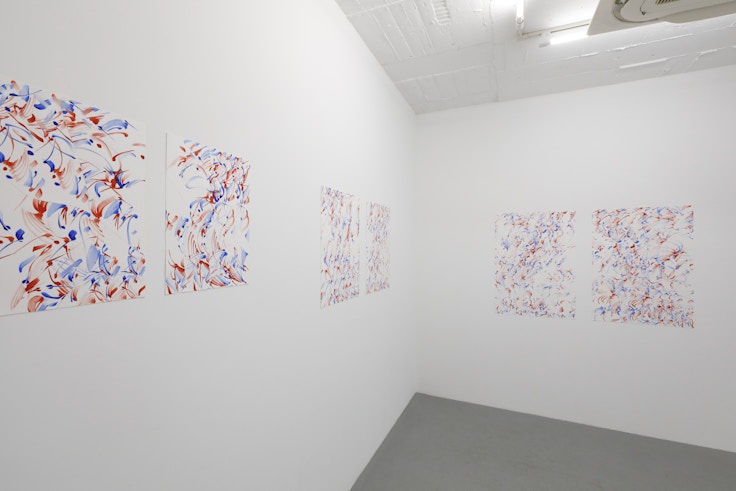 村山はまず1枚のドローイングを描き、それをカッティングプロッターによって有機的な線で4片に切断した。同サイズの白い紙も同じ形状で切断し、その2セット8片を互い違いになるよう組み替える。時計回りに、余白/ドローイング/余白/ドローイング、といった具合にだ。そうして出来上がった2セットそれぞれの余白部分にドローイングを描き足し、埋めていく。この切断ー再生のプロセスは、まるで傷を修復していくかのようだ。また、1つのドローイングが相似的な2つのドローイングへと増殖していくさまは、細胞分裂のようでもある。