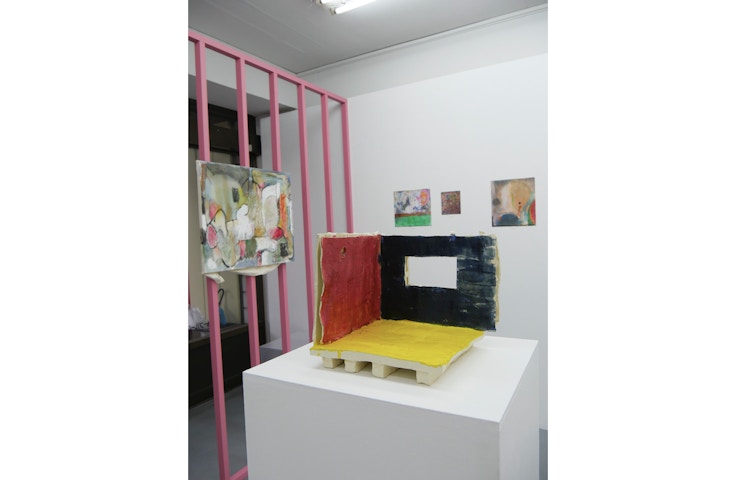 同展には、模型にまつわる作品が複数展示されている。すなわち、2×4(ツーバイフォー)工法の建物を模したという梅津の陶芸作品《密室》(2019-2020)。東京の日本橋三越本店で開かれた「フル・フロンタル 裸のサーキュレイター」展(2020年6月10〜29日)の模型を囲んでいる梅津らの姿を描いた安藤の《フル・フロンタル展の模型を見る梅津庸一としー没と星川あさこ》(2020)、そして立体的なゲーム盤のモデルであるアランの《渡り鳥のゲーム》(2020)。これらの模型もしくは模型を主なモチーフとする絵画がピンクの格子の内側に配置され、外側には家の模型を半透明の樹脂でできた箱で覆った播磨みどりの立体作品《婚約(実家)》(2004)が設置されている。