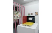 播磨の立体作品《婚約(実家)》は、「常設展II」が目指すシンプルで再展示可能な会場構成のイメージをもっとも雄弁に物語っている。すなわち、会場構成全体をコンパクトに収納、持ち運び可能な一種のキットとして設計し、必要があれば展示をまるごと保管することも別の場所で再現することも可能な状態にしておくこと。ピンクの格子は、その運用を実現するためのモジュールとして機能している。