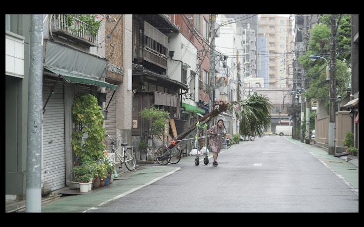 同時に会場入り口部分では、渡邊による映像作品《棕櫚の散歩》も展示されている。この作品では、その土壌からは動けないはずの大きな樹木を、荷車によって展示会場まで人力で「散歩」するプロセスを見せている。そのプロセスを通常のドキュメンテーションと、棕櫚の各部分に取り付けられたカメラによる映像の双方を2つのモニターで提示している。