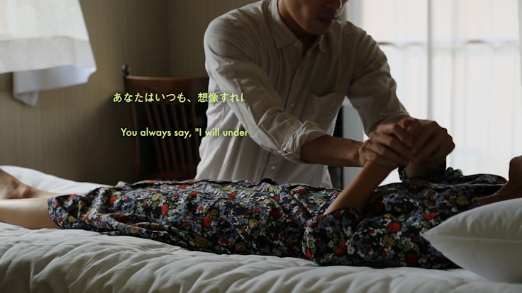 展示全体を通して「男性」はほぼ排除されているが、暴力的に介入・回帰してくるのが、百瀬文の映像作品《Social Dance》(2019)である。ベッドに横たわる聾者の女性と聴者の男性が手話で会話するうちに、女性が恋人をとがめるささいな出来事が、両者の溝と口論に発展していく。ここで戦慄的なのが、「手を握る」という親密さや慰めであるはずの行為が、「手話で話す相手を遮り、発話を制止する」暴力へと反転する事態だ。百瀬の作品は、「手話のコミュニケーション」のかたちを借りて、聾者と聴者の関係に「ジェンダーの非対称性」を重ねることで、「男性が女性の声を抑圧し、封じる」構造を批判的に暴き出す。