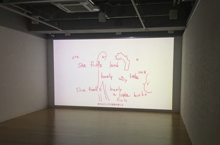 詩の朗読とアニメーションを組み合わせた《Lip Wrap / Air Hug / Energy Exchange》。ポップな色調とフリーハンドの筆致で、キャラクターの前髪がそよぎ、瞬きをするだけの数コマのアニメーションや詩のテキスト、ドローイングが映し出される。音楽ファンが二次創作として歌詞のみを映像化するリリックビデオを思わせる映像は、人との接触を絶たざるをえないなかで、他者との触れあいや、コミュニケーションを求める行き場のない欲望を思い起こす。