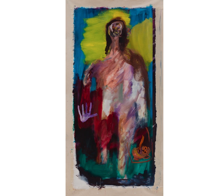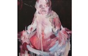 6名のファイナリストの作品が並んだ最終審査に、絵画がひとりだけ残っていた。血のテラテラした内臓を股から吐き出しているような紅い絵の具。ピンク・クリムゾン、ローズマダー系のやけにエロい色彩の背景には黒! 濃い闇がある。暴力的でバイオレンスなイメージがのたくってる割にはクラシックな画だ。