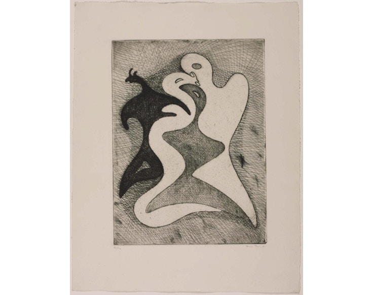 もうひとりの同族は、生命のかたちの心理的、神話的、生物学的に錯綜した、ありかたをフィギュアで表現したマックス・エルンストである。ミケーレの作品は、地上に最初にあらわれた生命やかたち──シンボルとの関係を一つひとつ丁寧に思い出していくような過程が感じられる。鳥(ロプロプ)をはじめ、さまざまな要素、自然、時代背景や心理とヒトとのハイブリッド概念をフィギュアで表したエルンスト。ミケーレ《floating organism》(2020)とエルンスト《dangerous correspondances》(1947)を比較してみよう。むろん、前者のかたちは、むしろミロやマテイスと親和性があるともいえる。後者が内包している闇、ふたつのかたち(figure)が持っている親密だが曖昧な危うさを秘めた関係とはむしろ遠いものに見えるかもしれない。だが私のなかにまずやってきたのがこのふたつのイメージの親和性だった。ミケーレの単純化したシンボリックなかたちのなかにこれらの葛藤や闇の浸透が含み込まれている。見るもののこころをひっかける呪文的要素、神秘的な要素は透明感や光のなかで柔らかに透けて見えている。