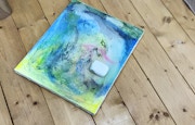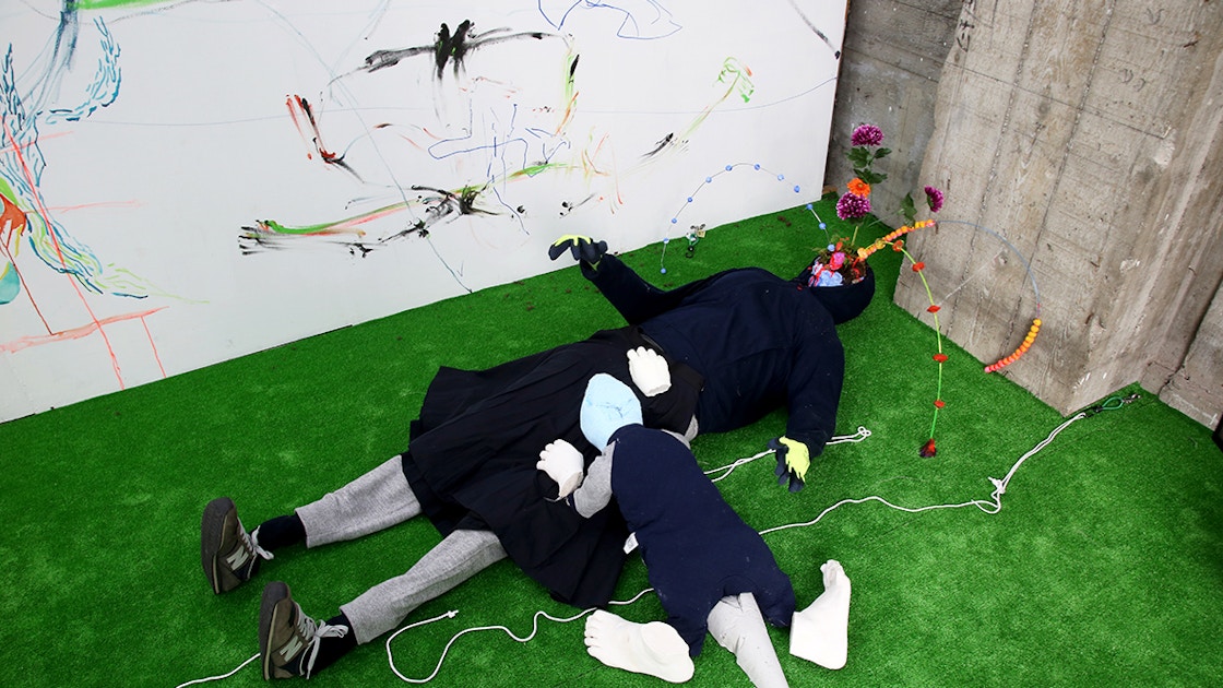 まず、そこで起こっている状況をざっくりと説明する。L字型の部屋、入って右手に透明樹脂でつくられた山のかたちのようなオブジェ、壁面には作者が窓に息を吹きかけ掃除をするループの映像、部屋の角に大量のマーガリン。その奥には冒頭で述べたような、寝そべり手を伸ばすだけでなんとか生活が行えるようなマットレスと生活雑貨。壁にはドローイングがかけられている。マットレスの上には、およそ成人男性ぐらいあるであろう人形がいる。L字型の部屋を曲がると人工芝が敷かれており、亀の映像と子どもとそれよりやや大きいくらいのサイズの人形がいる。壁にはまたドローイングがかけられている。