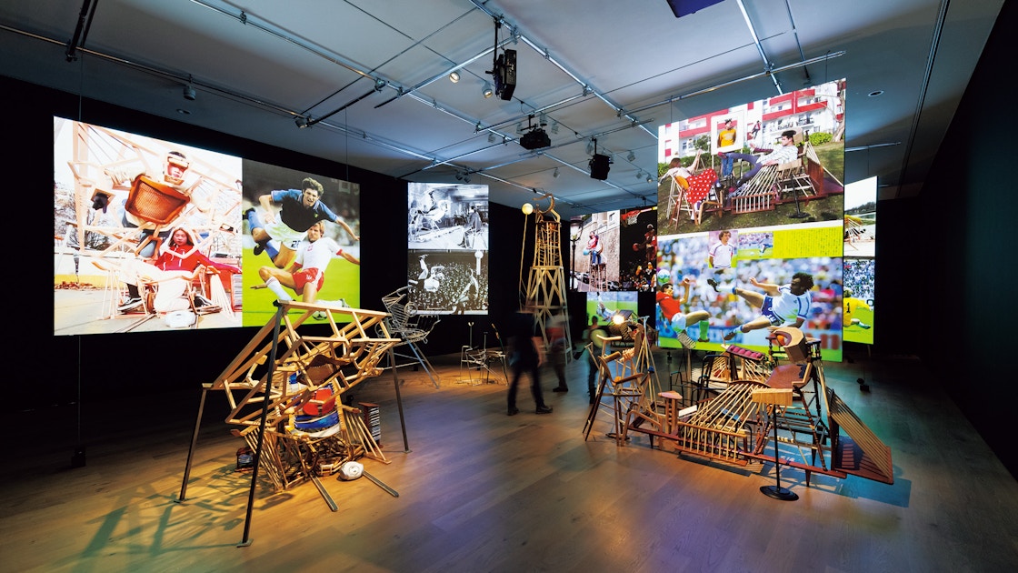 とはいえ、観客にもっともアピールしていたのは、少し前のシリーズ「くすぐられる夢を見た気がする」(2016〜17)であった。スポーツ雑誌を賑わせるアスリートの決定的瞬間の写真は、それ自体、なんともシュールな画像である。人はありえない姿勢で宙に浮き、ボールは止まっている。時間と重力から解放された無意識の姿は、すでに見慣れた視覚文化の一部とはいえ、撮影されたシューターたちの、無防備に撃ち抜かれた姿は、本質的に滑稽である。この滑稽さは、もともとのプレイの求心性(ボールやゴールを目指す)が写真の焦点に乗っ取られて、シュールな姿勢の理由が消えてしまうことにも由来するだろう。「くすぐられる夢〜」は、この無意識の笑いを回収する装置である。作家は重力下で、時間の流れのなかで、この無意識の姿勢を意識的に再現するために、家具やワゴンなど人と物を支える道具を解体し再構築した。そこへ、欧米アスリートとはかけ離れた東洋人が、実際にその装置に身を委ねて欧米アスリートの姿勢でじっとしている動画が添えられる。装置はなかなかよくできていて、図らずもティンゲリーへのオマージュになっていた。