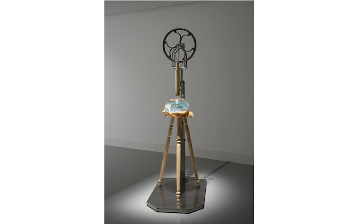 奥の展示室に進むと、キネティックなオブジェがもうひとつ、体液を思わせる液体に生を吹き込んでいた。デュシャンの《自転車の車輪》を連想したのは「泉」を見た直後だからか? 上部にある車輪のようなものが回転すると、その下の大きな金属棒がピストン運動を開始し、粘着性の強い液体の入ったガラス容器にその先端をゆっくりと挿し入れる。ガラス容器はそれ自体が液体であるかのような有機的な形をして石の上に座り、木の脚がそれを支えている。内と外がもっとも近いところで接触する場としての生殖行為を象徴しているというこの作品《Never the Same》は、機械仕掛けの部分が男性、有機的な素材でできた部分が女性を表すそうだが、機械部分に優美な曲線を持つ円形のハンドルが使われていたり、石や木の脚はどっしりとしたつくりになっていたりと、人間社会で期待される性的役割を表象するような表現はあまり見られない。