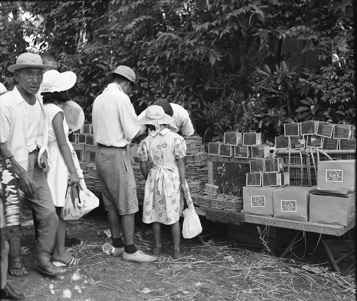 埼玉県杉戸町にある永福寺の大施餓鬼の縁日で見られた虫売りの屋台です。虫の種類は不明ですが、鈴虫など鳴き声を楽しむ虫と思われます。虫と一緒に竹ひごで作られた虫かごも商っていました。(展示キャプション)