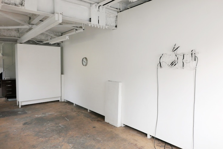一節をめぐるこうしたエピソードに対して、展覧会を構成するのは限られた要素だ。消灯した「ráɪt」の形をしたネオンが壁にかけられている。その隣には、時計が同じく壁にかけられ、3時50分を示したまま止まっている。その奥の机には「raɪt frəm ðə left tə ðə raɪt əz juː siː ɪt spelt hɪə.」と書かれた小さなカードが積まれ、持ち帰ることができるようになっている。