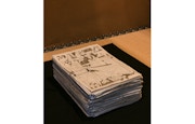 2階に上がると、文字は文としてかたちを成していく。牛島光太郎の《意図的な偶然》《組み合わせの方法》《一枚物語》は、イラストや作品と文の間の関係性を想像させることで、紡がれた文章に鑑賞者の貫入する余地をあえて残している。対して岩崎司の作品は、文章の意味そのものよりも、まず描かれたイメージと筆跡に圧倒されてしまう。