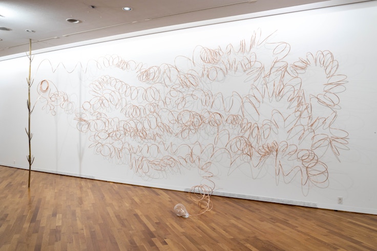 第1展示室は大型の新作インスタレーション《見えない力―軸・経度・緯度》を中心に展開され、第2展示室はガラスケース内に展示されたドローイング《枝とともに》、それが立体化された《空間に描かれたドローイング》がメインで展開されていく。