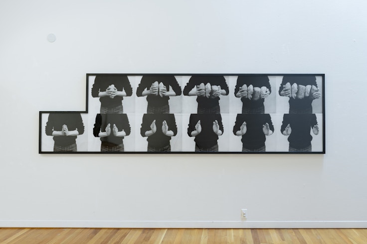 まず、展覧会全体を見るうえで特に興味深かったのは、展覧会のタイトルを固めていく植松の思考がそのまま表れている《言葉》だった。エントランスホール2階の通路の壁に貼られたこれらの紙片には、頭に浮かぶ言葉がそのまま走り書かれ「みえないものに触れる方法」と「直観」に蛍光ペンで下線の引かれたものや、「言葉ともの」と題された植松の制作やコンセプトに関係する単語が羅列されているものがある。「言葉ともの」にはいくつかのバージョンがあり、単語だけでなく「見えない〜」と「〜に触れる」に、様々な単語をつないでいくものが面白い。