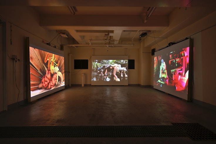 また本展の企画者のひとりである林千歩による3本の映像を同時に上映したインスタレーション(?)は、作者の身体を被写体としてスクリーンに複製しながら、手作りのセットを用いて表現された「花占いによる自問自答」「鏡写しの羊のドリー」「仏像の妊娠」というそれぞれの主題によって、生命についてのトートロジカルで遊戯的な領域をつくり出している。