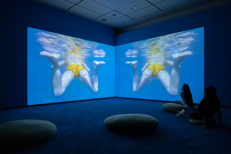 そのため、鑑賞者は必ずしも定められた一点から正座してスクリーンに向き合うわけではない。ベッドに寝そべり天井の映像を見上げる、映像と映像のあいだをうろうろと歩き回る、自らスクリーンとなって映像を浴びる、といった具合である。さらに、多くの映像で、外部へと拡張しゆくイメージ(水中、風景、空、宇宙)と細部を接写するイメージ(体の一部や地面、草花へのクローズアップ)が繰り返し登場し、鑑賞者のスケール感覚をも自在に揺さぶる。