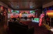 こうしたスケールの往還の只中に置かれた鑑賞者にとって、硬い靴底から足が解放されていることは少なからぬ意味を持つ。ピピロッティの作品の持ち味である触覚性をよりよく感知できるからだ。例えば、足元から伝わる柔らかな絨毯の感触は大きく映し出された花弁の、細やかな起毛を想起させる。あたかも、小さくなって花弁の上を歩いているかのようだ。こうして鑑賞者は、無尽に変化するスケール感覚と触覚性に誘われ、美術の鑑賞者から、晩餐の招待客、さらには花粉まみれの虫や川底で揺らめく水草というように、様々な人や生物へ変身を繰り返すこととなる。