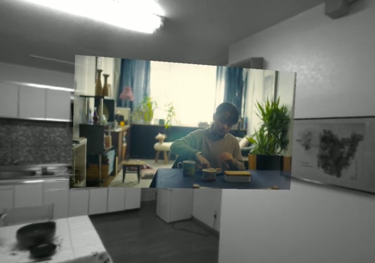 《サスペンデッド》を見たとき、すぐに《THE HOUSE》を思い出した。《サスペンデッド》は本作を撮影した現場である「家」自体がAR映像の視聴会場として使われ、鑑賞者はその家の玄関でARゴーグルを装着し、光の粒子でつくられた導線に誘われながら現実の家で時を過ごし、その家の中で起きた別の時間軸の映像を見る。中村の手法は、アッテラが見せたような「家」の中に、観客を身体ごと取り込むものだ。ARを使用することで、現実の二重性、パラレルワールド感をより強化する。バーチャルだとわかっていても、例えばARの黒い画面が鑑賞者の身体を通り抜けるシーンは、大きな虚無に飲み込まれるようで、非常に怖かった。