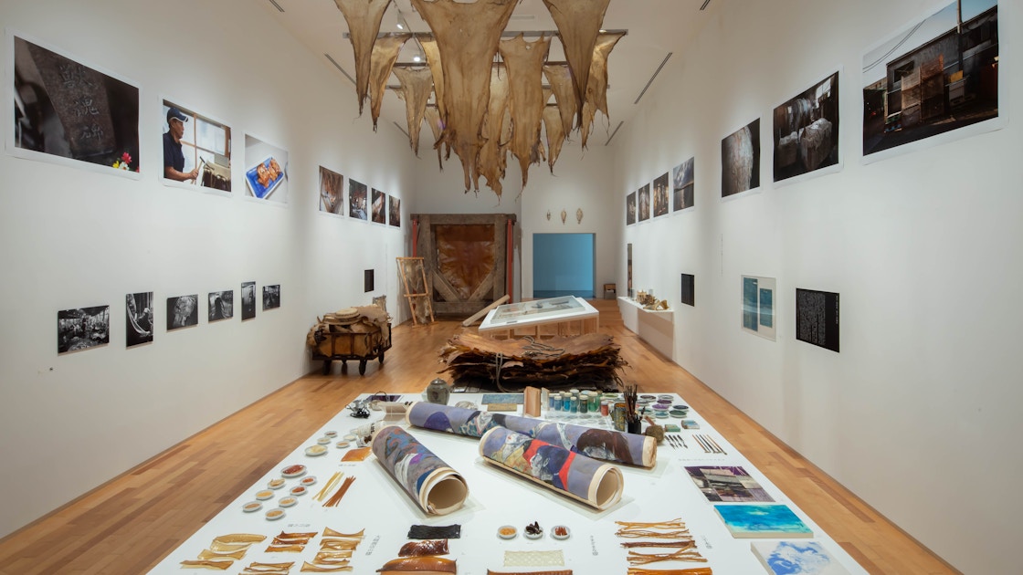 一見、スペクタクル=見せ物的な展覧会である。会場の武蔵野美術大学 美術館・図書館、その前庭には、皮なめし工程で使われるタイコと呼ばれる巨大なドラムと、皮を仕入れる際に使用される金網ケース──いずれも、長期間におよぶ使用感が見受けられる──が置かれている。また、展覧会手前で鑑賞者を出迎えるのは、牛骨(頭部)であり、再びのタイコ、金網であり、大量に積まれた牛の生皮を被写体とするモノクロームの写真であり、膠の乾燥台である。そしてメイン会場と思える展示室4に足を踏み入れれば、天井から鹿の乾皮が吊るされ、壁一面に数百にもなる膠が展示され、あるいは牛の乾皮が積まれ、板張りという皮の乾燥作業をするための巨大な木枠が出品されている。