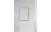 棚状のフレームは、なかで様々な画布が互いにつっぱりあい、あるいはだらりと垂れ下がったり折れたまま収まったりするためのフィールドを構成していますが、きちんと管理されている棚ではそのようなことは起こりません。商品は無理なく棚に収まることで、折れたりせず自身の商品価値を維持します。益永作品では棚の秩序・規律が開放され、棚の自由空間が現出しています。時間の経過とともに内容物の折れ方が強まったり、もしかしたらずり落ちたりするのかもしれません。