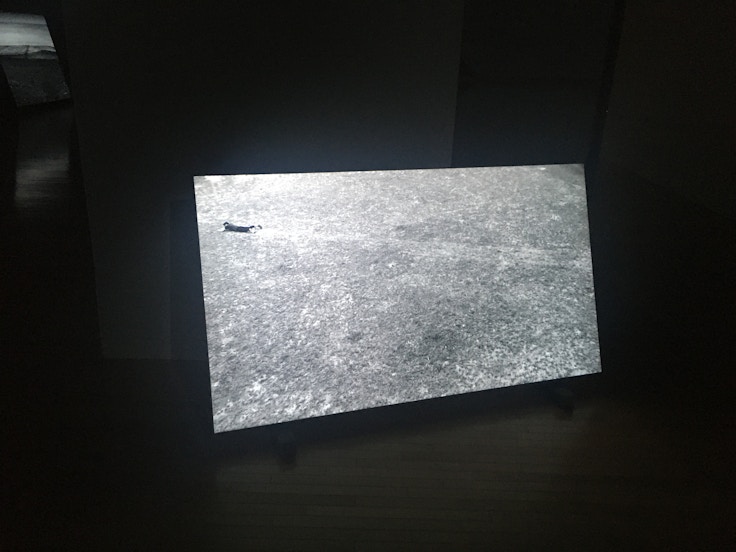 展示室に立て掛けられた6つのキャンバスには、個別に制作された映像が映像内の水平線が一直線になるようプロジェクションされている。展示室に現れているのは、複数の時空間をつなぎ合わせたランドスケープだ。絵画空間を思わせるモノクロームの色調と構図もまた、そうした高い抽象性を支える。潘の日常行為は本来それが行われるはずではない環境とのあいだで齟齬を起こし、滑稽だが確かな衝突を伝える。