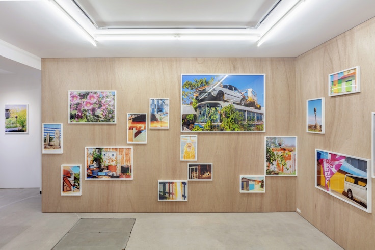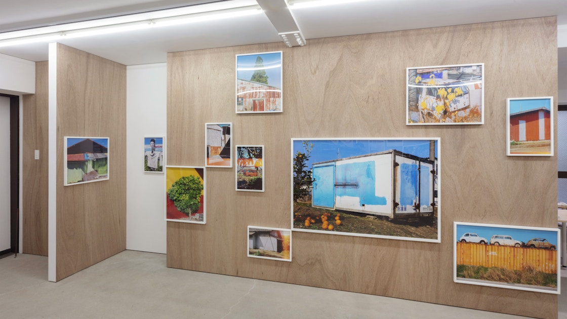ギャラリーに足を踏み入れた途端、色鮮やかで奇抜な写真群に四方八方を取り囲まれた。庭に打ち棄てられて植物に浸食されるがままの廃車、なぜか横倒しの状態で平面的な意匠を強調するパチンコ屋の看板、迷彩柄のごとくからだの白黒模様を周囲の景色に紛れ込ませた牛たち。どうやらカメラの目は人間不在の場に放逐されて経年劣化した事物──とりわけ廃車やトタン壁の金属的な錆つき──に向かいやすいようなのだが、古色の風合いだけでなく、植物のフレッシュな緑、底抜けの青空、ペンキ塗装の人工的な色彩なども好んで採集しているようだ。