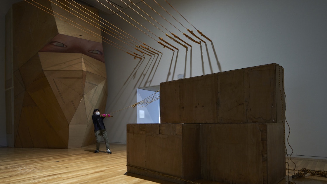 ひとつの作品には、初出時には見えないたくさんの可能性が眠っている。こうした作品たちを召喚して、これまでとは異なる文脈に位置付け、新しい意味を引き出すのが回顧展だ。加藤は今回、作品を制作年順には並べなかった。そして、たとえば「カン・カン・カン・カン」という木槌の音が一定の調子で鳴り続ける《A》(2009)と、巣穴に取り付けられた鈴がプレーリードッグの動きにしたがってチリチリと音を出す《Underground Orchestra》(2017)を、音というつながりによって同じ空間に置いた。音という要素は、続く一番大きな展示室の「引き倒し・引き興し」シリーズの音声に引き継がれ、次いで回廊部分の、互いに引き合う力に逆らって楽器を演奏する《Woodstock 2017》(2017)や《2689》(2019)につながった。こんなに楽しい再編作業を行うのに、何も人生の終わりまで待つ必要はないだろう(しかし、伸び盛りのアーティストの回顧展を今回のような規模で開催できる施設は、日本にはとても少ない。その意味で加藤は幸運な例外だ。この問題はまた別の機会に考える必要がある)。