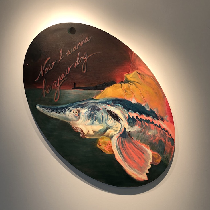 イギー・ポップは1960年代に音楽活動を開始したミュージシャンで、過激なパフォーマンスと60年代にザ・ストゥージス名義で発表した楽曲の数々でその名を知られている。代表曲のひとつが本展の作品《Young sturgeon (says now I wanna be your dog)》に引用されているわけだが、作品の印象は楽曲の破滅的で甘ったるい歌詞とはかけ離れている。本展のなかでもとりわけ微細な筆致で楕円形のキャンバス描かれた魚は「Now I wanna be your dog」とつぶやいている。楊は本展開催にあたり、アルノルト・ベックリンの《魚に説教する聖アントニウス》(1892年、チューリヒ美術館蔵)から着想を得たという。