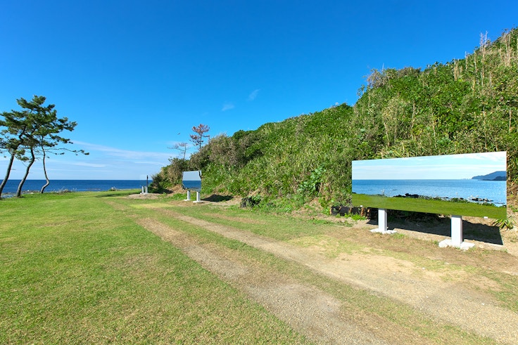 キムスージャが、鰐崎海岸に設置した3枚の鏡のインスタレーション《息づかい》と、小屋の窓に設置した《息づかい─旗》は、誰の視覚をも楽しませてくれるだろう。おそらく作品を考える前に、鑑賞者は鏡の前で絶海を背景に自撮りし、能登半島の外海、厳しい日本海とその先の半島、大陸との関係を相対化する。いや、自撮りをInstagramにアップロードしながら、ハッシュタグを探りながら、この意識をするだろう。作品の冷徹な批評性は、観客の眼差しを問うているのだ。