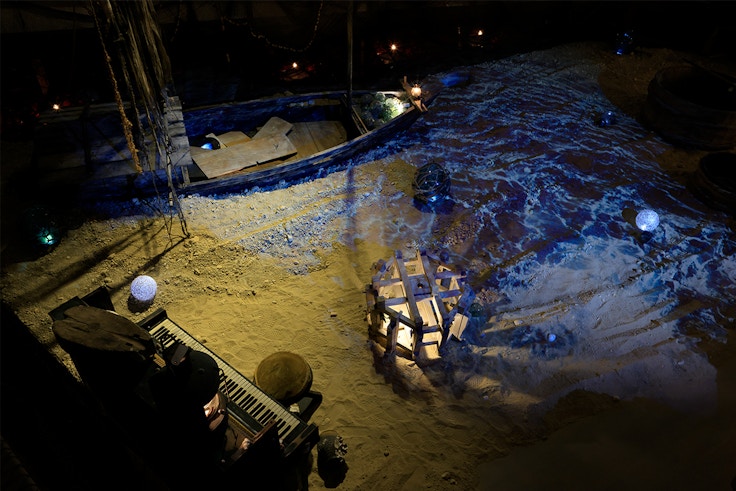 南条嘉毅による《余光の海》は、珠洲市の日常の表象を抽象化し、音と映像でその起源から現在までを描く。展示され、パフォーマンスを構成する民具は、地域の蔵から収集された品々だが、骨董が含まれるいっぽうで、20世紀後半のメディア技術も対象としている観点がおもしろかった。例えば、1960年代のブラウン管テレビモニターである。「農協テレビ」とも呼ばれ、通称の通り、農協が販売していたという。ミュージアムの一部が、サテライト(さいはてのキャバレー)にも展示されていたが、民具とともにやはりブラウン管モニターが設置され、「光の方舟」の様子が流れていた。オンラインの配信が日常化したいま、テレビジョンの意味、つまりテレコミュニケーション(遠距離電気通信)の公共性もまた、民族誌の射程に入ってきたのだろう。