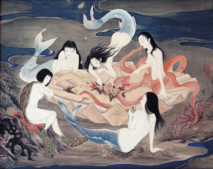 そうした一方的な消費の視線に異議を唱えるのが、「美人画」が内包する不均衡なジェンダー構造を反転させ、「美しい現代男性像」を「美男画」として描く日本画家の木村了子である。障壁画ふうの竜虎図に「健康的な若い男性ヌード」を配したり、人魚たちが刺身の「男体盛り」を楽しむ様子を描いた出品作は、「性的消費主体としての女性の眼差し」を肯定的に回復させる。