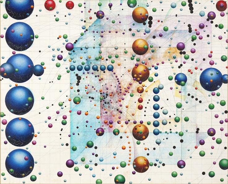 サンフランシスコ時代にオチの絵画に登場した立体的な球体は帰国後も引き継がれ、「球体シリーズ」として展開されていく。画面に点在する球体と、縦横無尽に走る線が図式的な関係を結び、その背景にはバーチャル空間のような小宇宙が広がる。このシリーズはオチのライフワークとして晩年まで続けられ、展示室においてもその膨大な量と密度が示されていた。