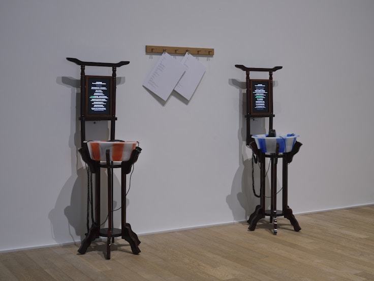 この大きなインスタレーションの横では、ひっそりと《From Sichuan to Shenzhen》(2017)が展示される。出稼ぎ労働者が住まうアパートの古い洗面台を模した台座に鏡のように設置されたスクリーンには、自らも四川から深圳に出て働く女性が電話で語る日々の苦悩が、スマートフォンで音楽を再生したときの歌詞のスクロールのように流れる。洗面器の中に置かれたヘッドフォンを耳に当てると、セリフと同期した彼女の声が流れ、過去に別れた男性や田舎の保守的な両親の結婚観、仕事関係の男性に性的な目で見られることに対するやるせなさが、現実に葛藤するリアルな感情を伴った声で聞こえる。