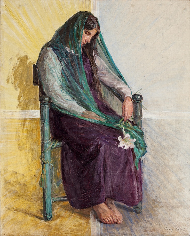 じつは、この「ユリを手に座る女性」と近い系統の作品が「神殿のための絵画」でも制作されている。「グループVIIIのための準備的習作、女性シリーズ」(1912)、「男性シリーズ」(1912)と呼ばれる2つの作品群のことである(残念ながら今回の展覧会には出品されていないが、図録のカバー裏に印刷された「神殿のための絵画」全点の図版で両シリーズを確認できる)。いずれも祈祷や瞑想に集中する修道女/修道士たちを一枚の画面にひとりずつ描いた肖像画であり、自然主義的なスタティックな作風ゆえに、様式の変化が激しい「神殿のための絵画」のなかではむしろ異彩を放っている。「女性シリーズ」の各作品に付された「剥奪(Deprivation)」「逡巡(Hesitation)」「恥辱(Humiliation)」「歓喜(Joy)」といったタイトルが顕著に示すように、これらは霊的探究の殉教者がたどる心的状況の定型表現なのかもしれない(オットーが『聖なるもの』で図式化した心的状況と比較してみてもよい)。