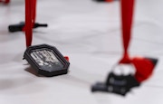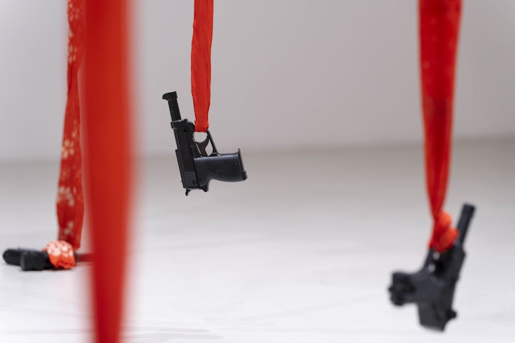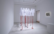 最初の部屋には日本のフェミニズム・アートの革新者である嶋田美子の作品を持ってきた。「ジェンダー 記憶の淵から」展にも出品された《風船爆弾・日の丸》(1993)と《白い割烹着(White Aprons)》(1993)に《赤ちゃんコンテスト》(1992)を壁面に加え、その斜め横にはインスタレーションが迫る。12枚の白い割烹着からはそれぞれ赤いひもが垂れ、その下には玩具のピストルや戦没者の写真、軍人勅諭が結ばれている。