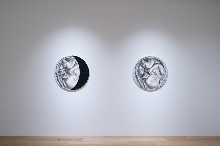 部屋の三方の壁面に6点の円型の作品が均等に配置されている。漆黒の宇宙のような黒く塗られた円型の作品は、三日月、半月、満月へと満ちていく。そして三日月型の表面から満月へと少しずつ露わになっていくのは、もちろん月面のクレーターではない。パールホワイトで緻密に描かれているのは、いまにも狭い円から這い出してきそうな、丸まった美しい裸の赤子である。少しだけ髪の毛が生えた大きめの頭部を下に、口の部分に小さな手がかかっていて、足は縮めて時計の11時の部分にある。あまりにも可憐な姿ゆえに、この子が臨月に死んだ母親の子宮にいる子供だと気づいた瞬間に、一気に周りの空気が凍りつく。この子は本来ならば人の目にふれられる存在ではないのだ。