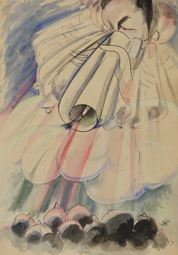そして、本展で一番の問題作となるのが大正天皇を描いた作品《遠眼鏡》(1920)だ。世間に流布した「遠眼鏡事件」を戯画化した本作は、未来派的ないし俳画的な手法によって天皇の姿を直写した。「遠眼鏡事件」とは、意思薄弱という噂のあった大正天皇が帝国議会の開院式で詔勅を読んでから、その勅書を丸めて遠眼鏡のように議員席を見渡したとされる風説。黒耀会第2回展に出品され、むろん警察によって撤回・没収された作品のひとつである。
