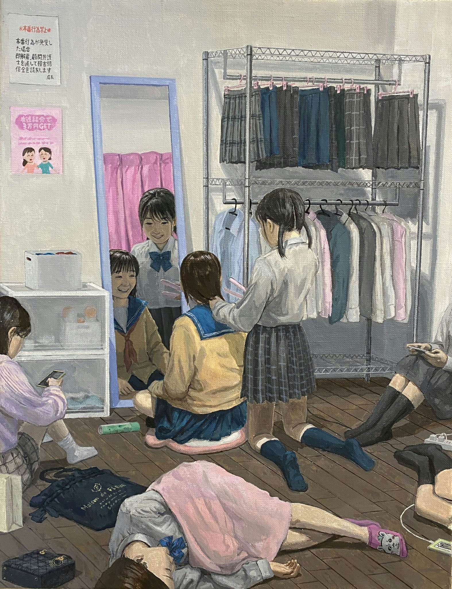 例えば、本展では自己の内面性を通してタブローに向き合う作家が多いが、その作品には明示的な社会的事象への回路が開かれている。JKリフレ(従業員の女性が女子高生の格好をしてマッサージを行う店)のバックヤードを描いていると思しき、ハムスターの息子に産まれて良かったの《待機室》(2024)が醸し出すどこか底の抜けたような明るさを伴う気だるさ、あるいは大西茅布の《辛かった日の電車-家族-》(2025)がたたえている希望の見えないぼんやりとした閉塞感から、作家の背景にあるものやコンセプトを知らずとも、さまざまな社会的要素を抽出することが可能だ。