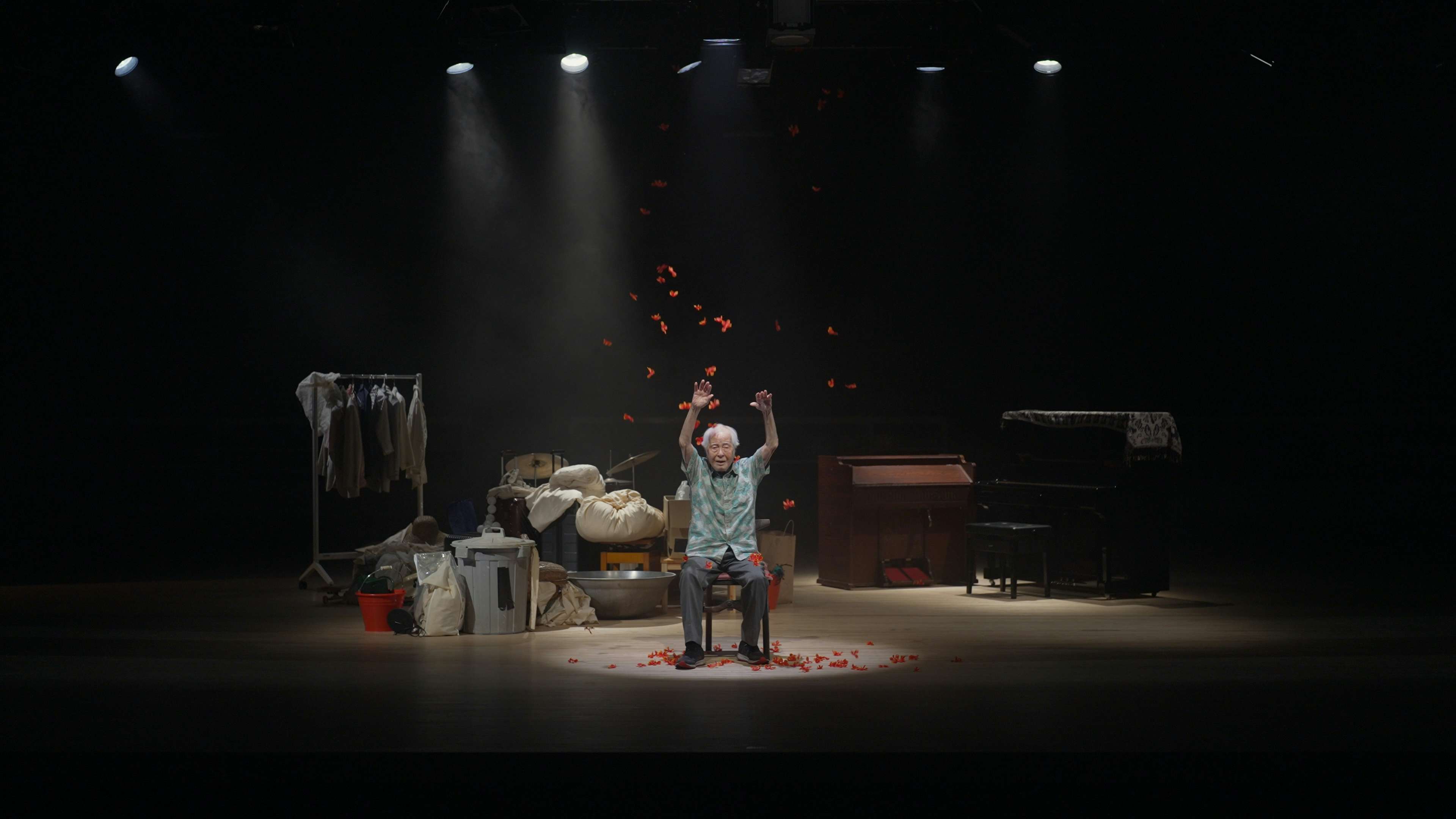 《ゴミとダンスを》(2024)は、時間を大きく飛躍させた想像力によって構成された作品である。人類が消滅し、ゴミだけが残った未来に、弥勒菩薩が現れ、ゴミとともに踊り出すという設定は、シリアスな終末論を戯画化している。ここで重要なのは、批判や警告よりも、不要とされたもの、忘れ去られたものと、人間の身体がリズムを共有してしまうという感覚である。それは倫理的な要請によってではなく、「踊りだしてしまう」ことによって、世界との関係を半ば強制的に組み替えていくのである。
