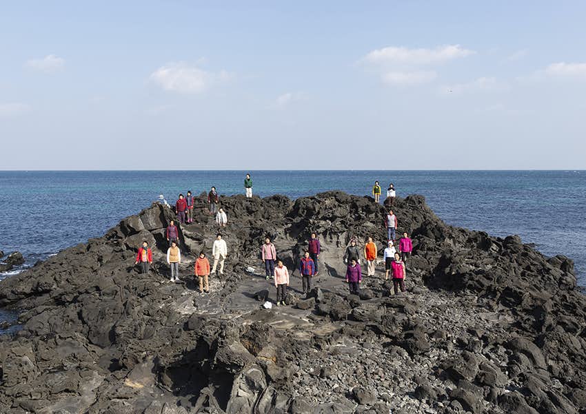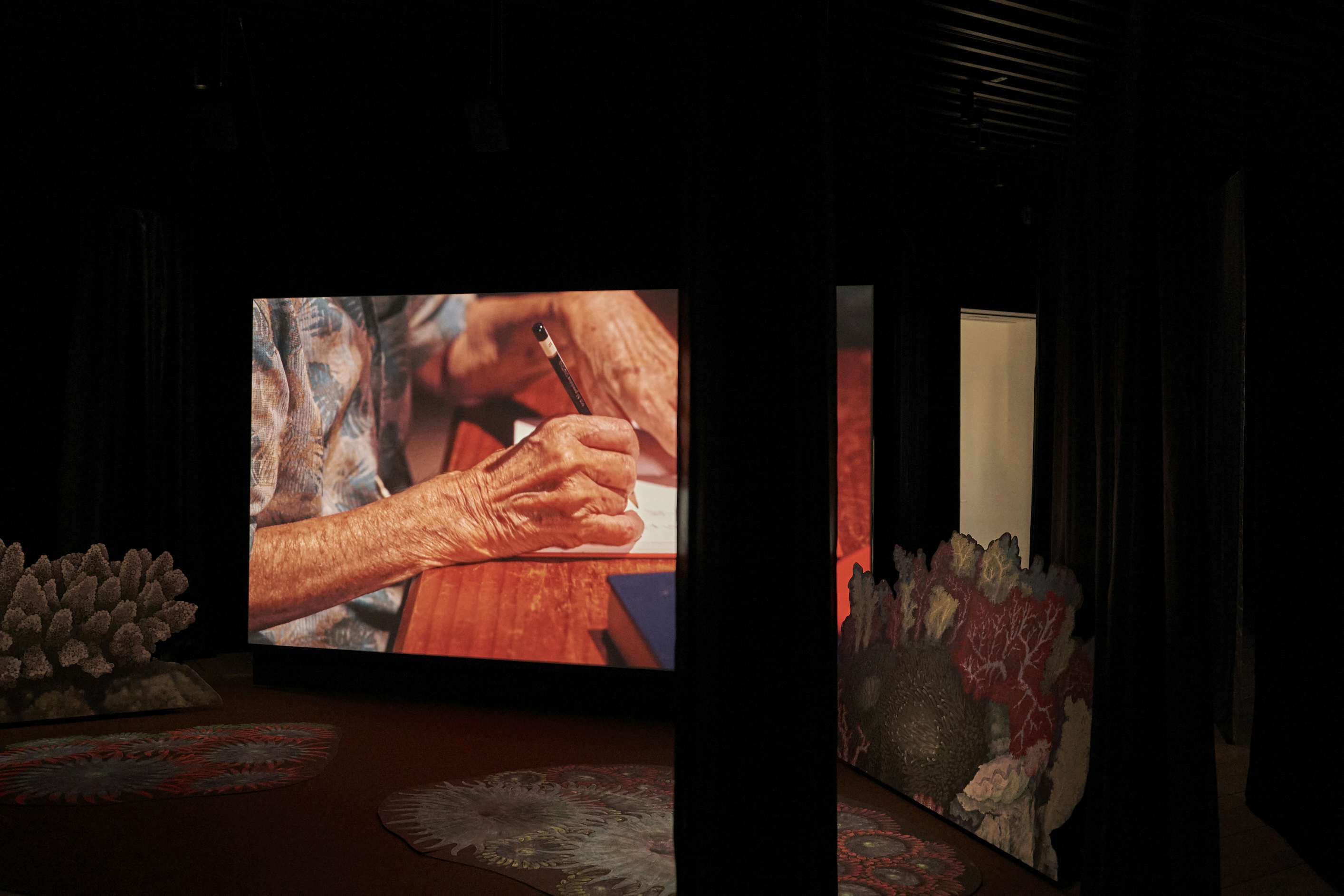 プログラムの核であろう《海草の物語》(2022)は、イキバウィクルルが済州島の河道村に約2年通い続けるなかで、海女たちによって結成された合唱団とともに制作された映像である。作品を貫くのは、合唱団のオリジナルソング「済州アリラン」の歌声であり、日々海に入る女たちの生活をなぞりながら、過去の争いや住民の虐殺によって島が負ってきた傷の記憶を静かに孕んでいる。観光地としての明るいイメージとは裏腹に、済州島の風景の下には、なお消えきらない歴史の層が横たわっている。海女たちは互いを、海での生存を助け合う仲間としてとらえ、イキバウィクルルの「潜りは、仲間と共に」という言葉(*1)の通り、集団的な実践のなかで生を支えてきた。本作における歌声は、生存のためのレゾナンス(共鳴)なのだ。